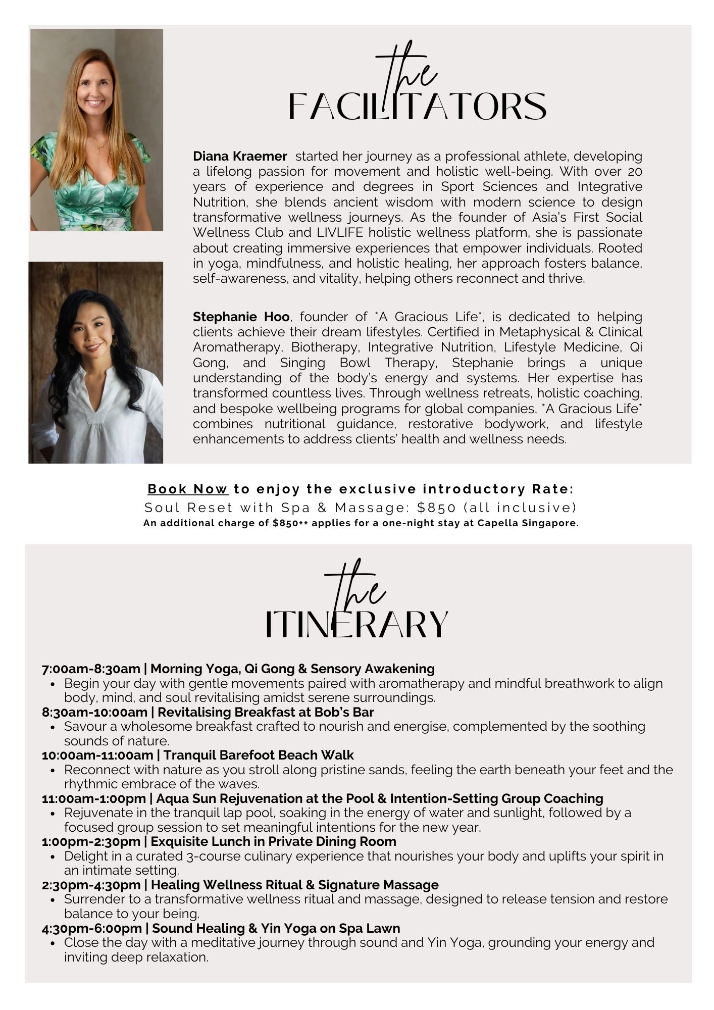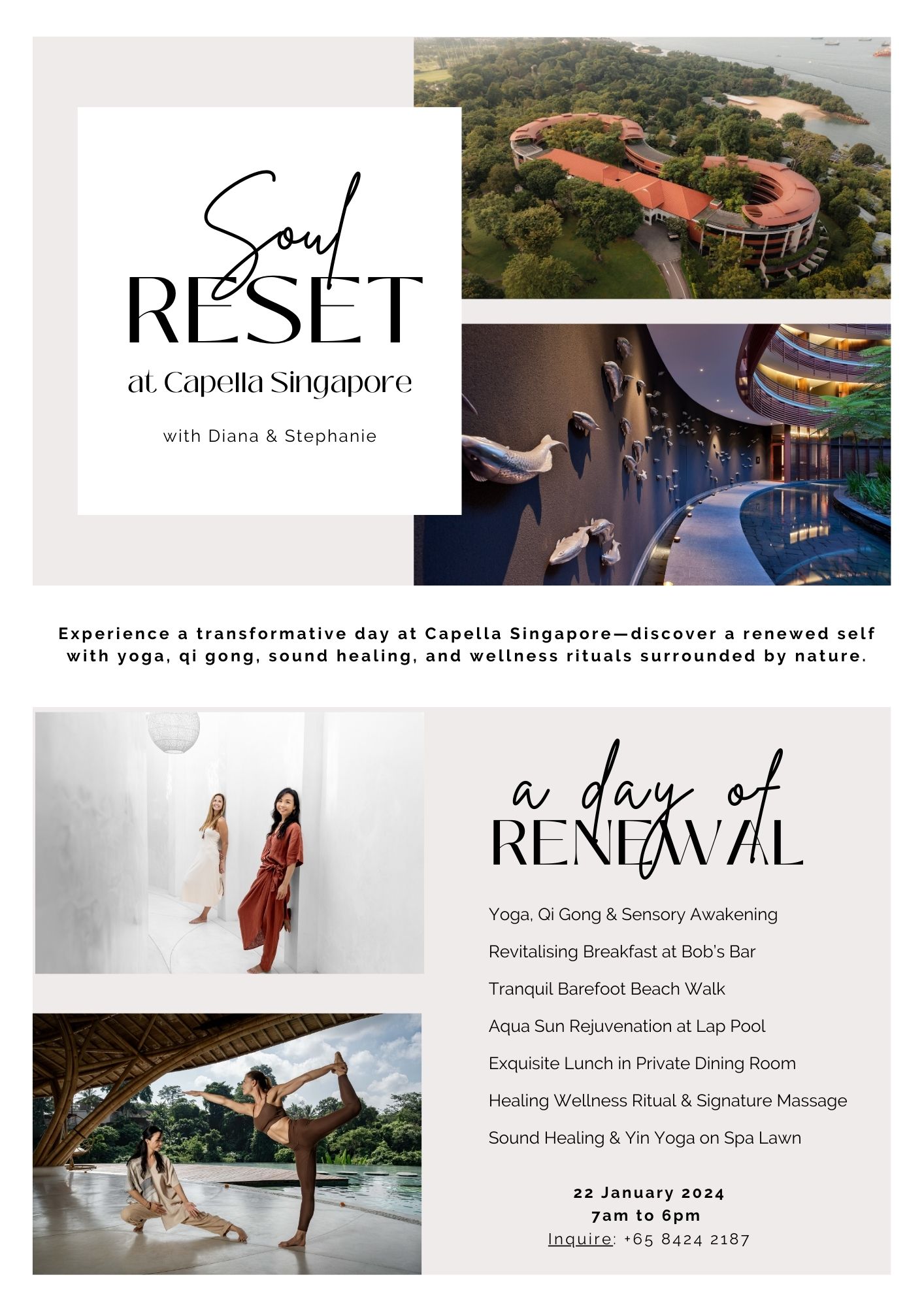 Step into 2025 with clarity, balance, and renewal at Capella Singapore. Immerse yourself in a holistic experience of yoga, qigong, sound healing, and nature-inspired wellness rituals designed to harmonize your body, mind, and spirit. This enriching experience also includes intention-setting sessions guided by expert coaching to help you align with your personal goals and aspirations for the new year.