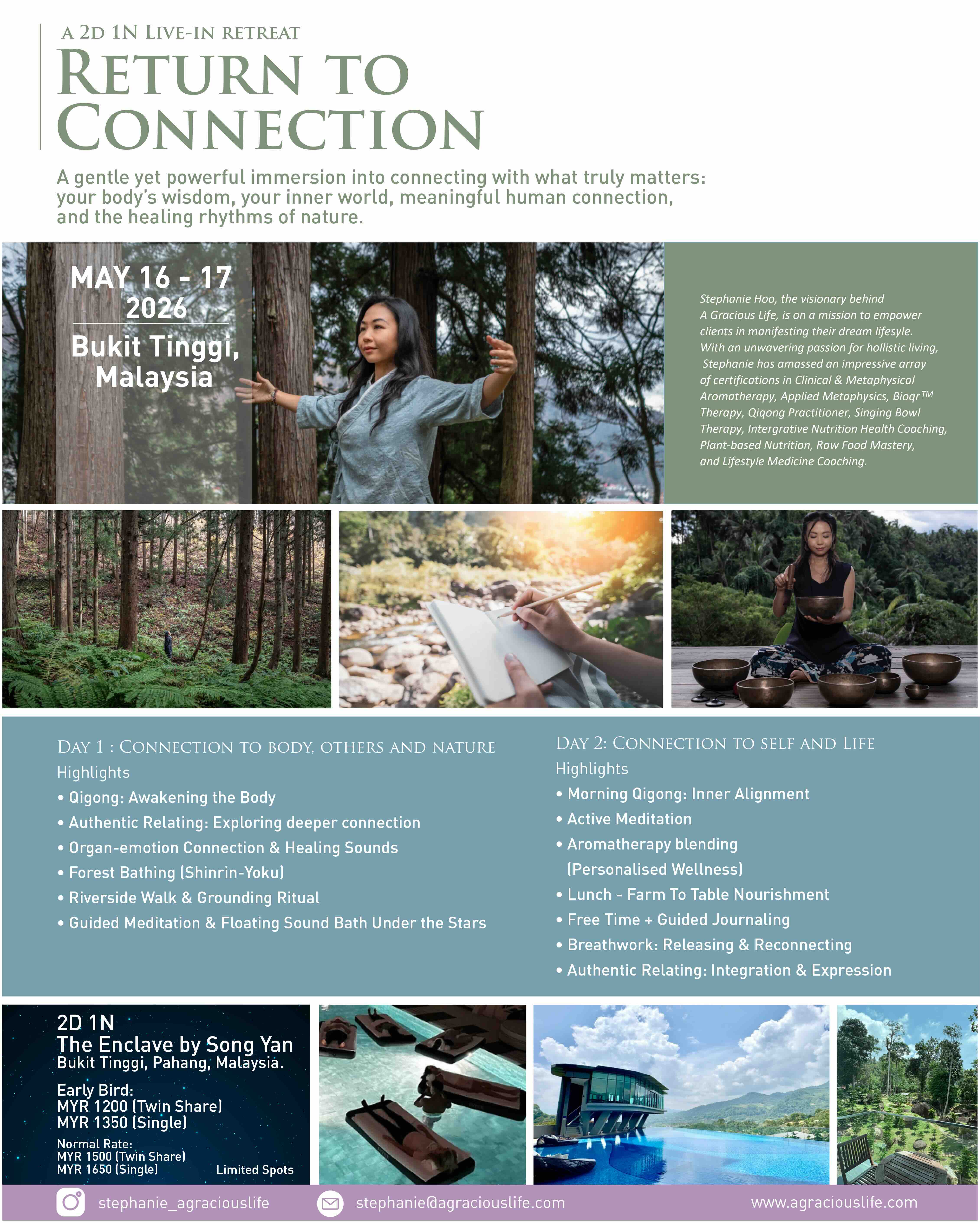 Set within the serene landscapes of Bukit Tinggi, this 2D/1N retreat is a thoughtfully curated journey into connection: to your body, your inner self, others, and the natural world. Woven throughout the experience is a gentle awakening of the five senses—the sounds of nature and healing vibrations, the scent of therapeutic aromatherapy, the touch of earth and flowing water, the sight of lush greenery, and the taste of nourishing, wholesome meals.