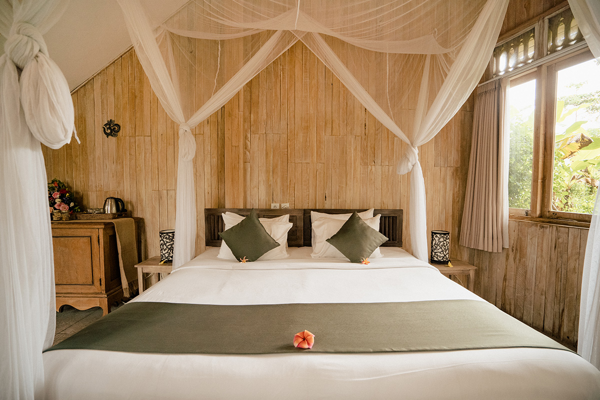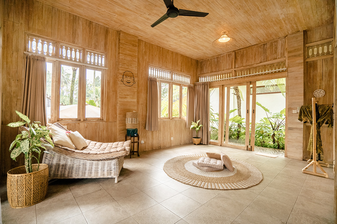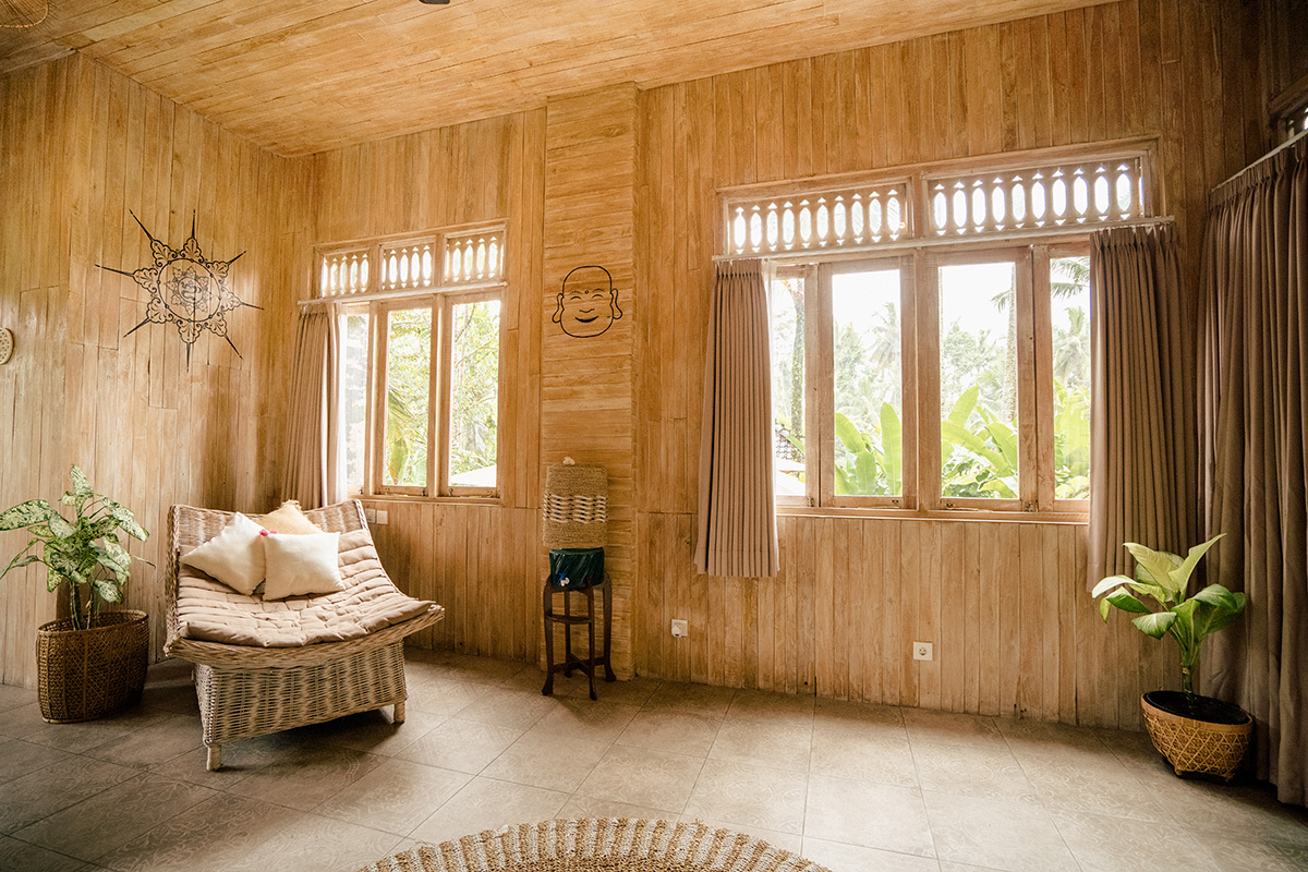 With natural light coming in from all three sides of the room - both of which are views of the jungle and the pool with our famous giant Buddha. This spacious yet cozy room includes a daybed for you to lay on. Jnana is perfect for those that like to be the closest to the main pool where you can take a dip, socialize and enjoy the warmth of the sun on a beautiful day (easy pool access and windows on 3 sides).