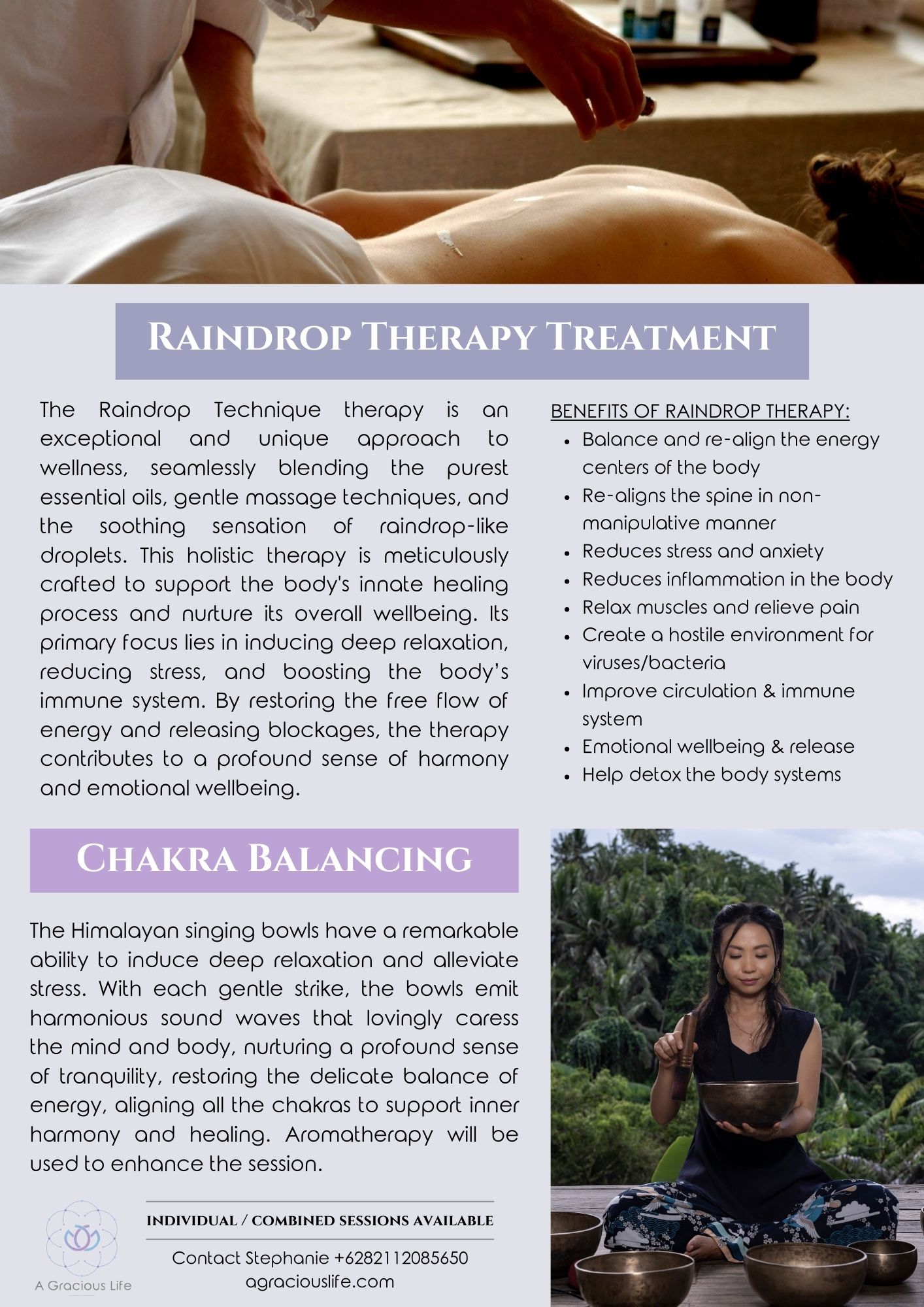 The combination of Raindrop Therapy and Chakra Balancing offers a transformative wellness experience that harmonizes the body, mind, and spirit. This powerful synergy blends the healing properties of pure essential oils and gentle massage with the vibrational energy of Himalayan singing bowls, creating a deeply relaxing and restorative journey. Together, they work to release energy blockages, align the chakras, and strengthen the body’s natural healing processes, fostering emotional balance, inner harmony, and enhanced overall wellbeing.
