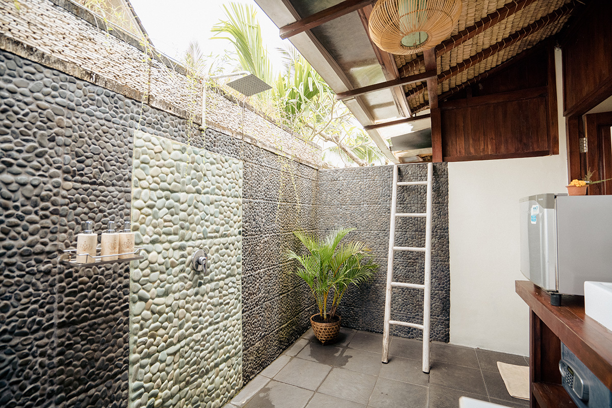 Shower underneath the stars. Our outdoor bathroom includes hot shower, towels, bathrobes, slippers & our specially made all natural Basundari toiletries.